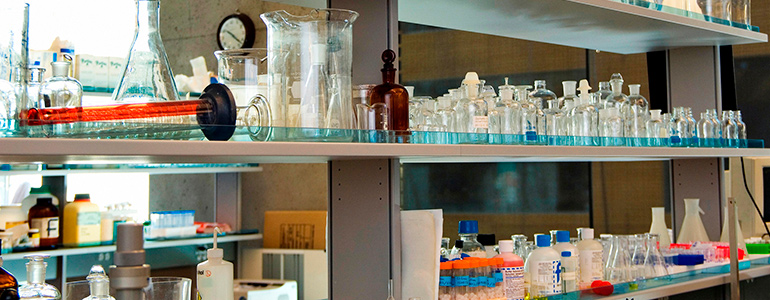 A rack of High-Performance Liquid Chromatography vials at an analytical pharma lab