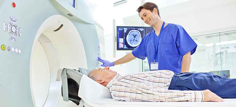 Male medical patient laying inside MRI scanner imaging device in a blue room
