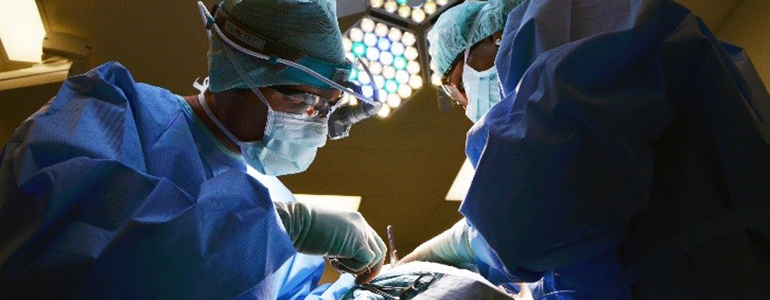 Male surgeon looking at the monitoring equipment during surgery. Doctor in medical scrubs performing operation in operating room and looking at pulse trace on monitors.
